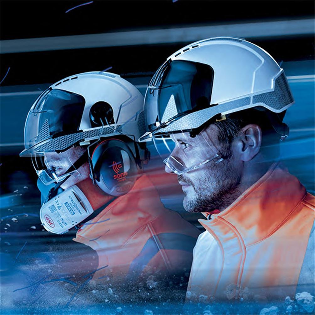 • EVO VISTAlens, vented, standard peak safety helmet with intergrated eyewear