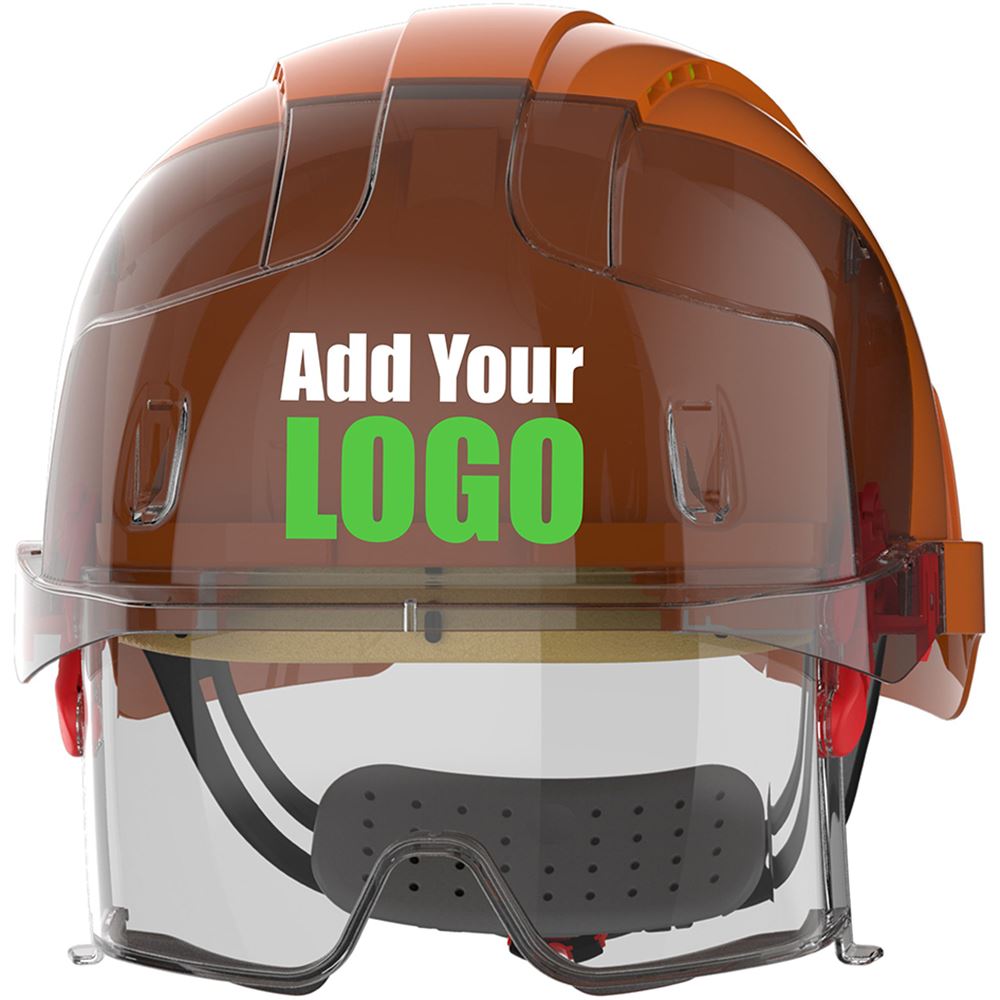 • Branded JSP EVO3 VistAlens custom printed safety helmets with front logo