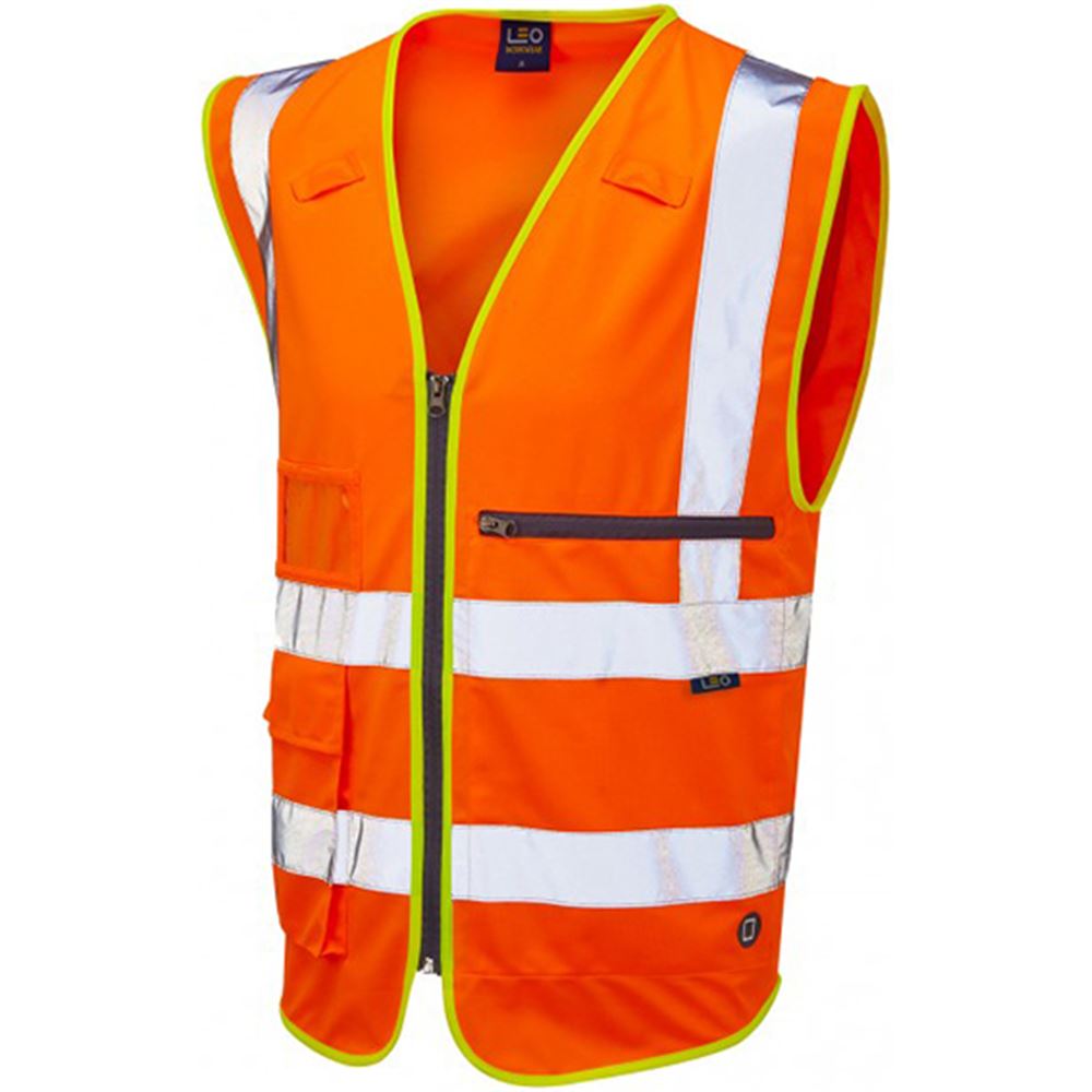 Leo Workwear Foreland Orange Zipped Superior Hi Vis Vest with Tablet Pocket